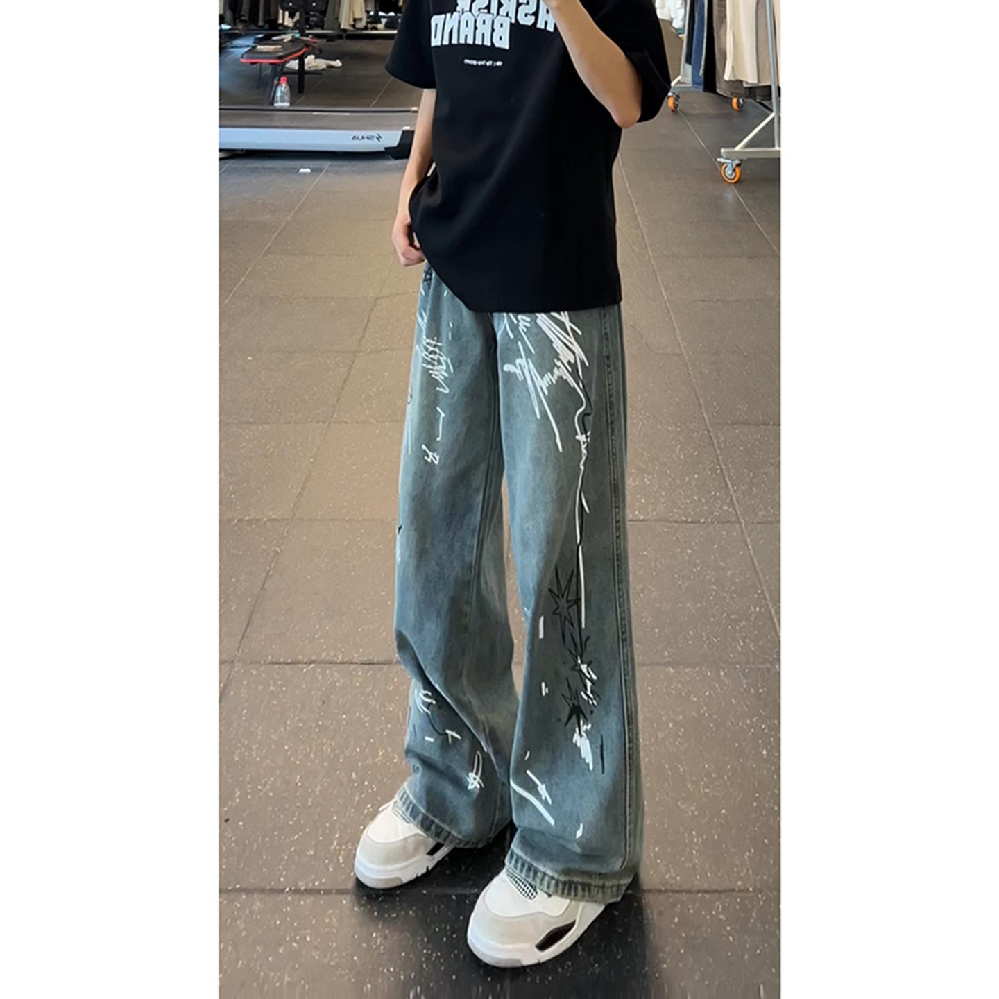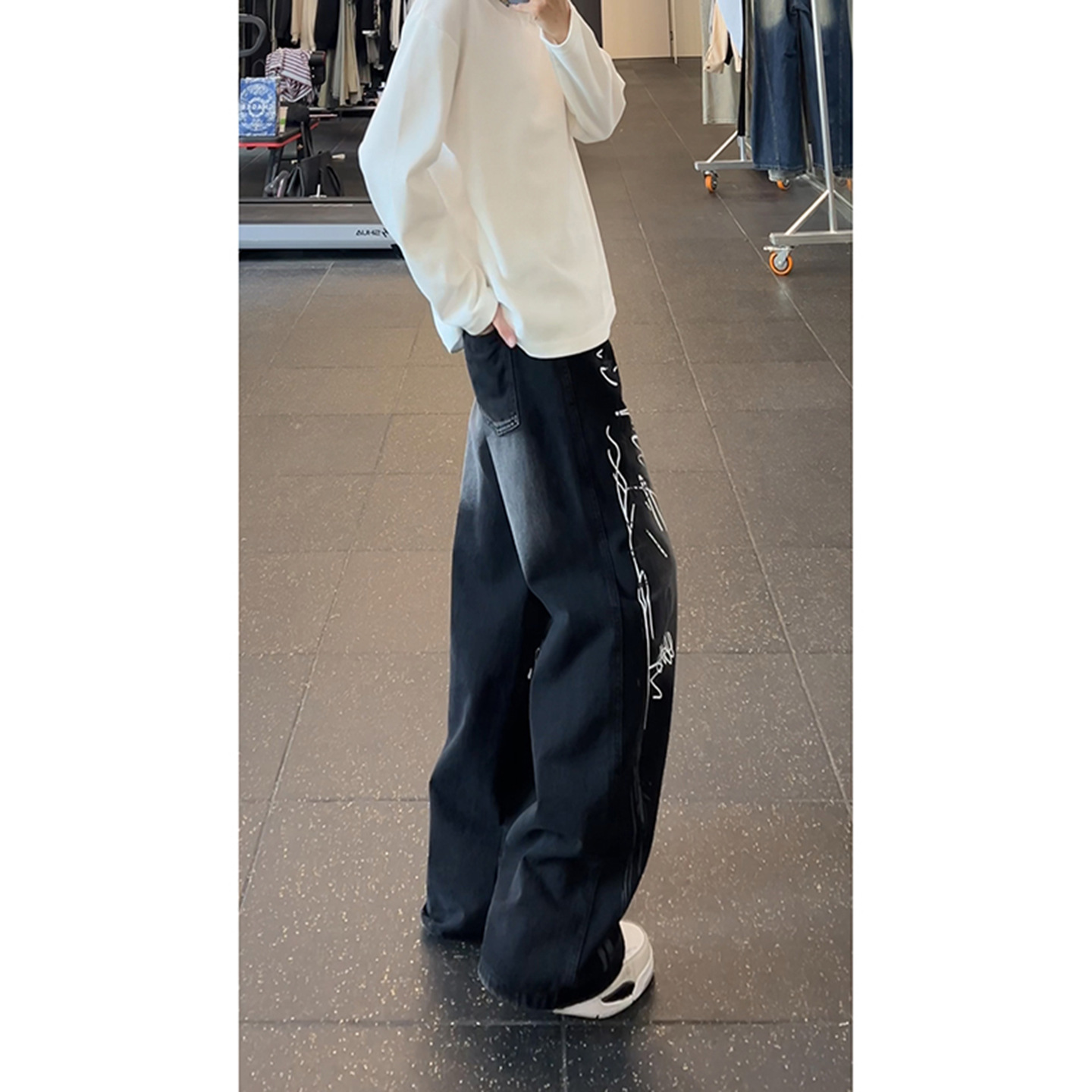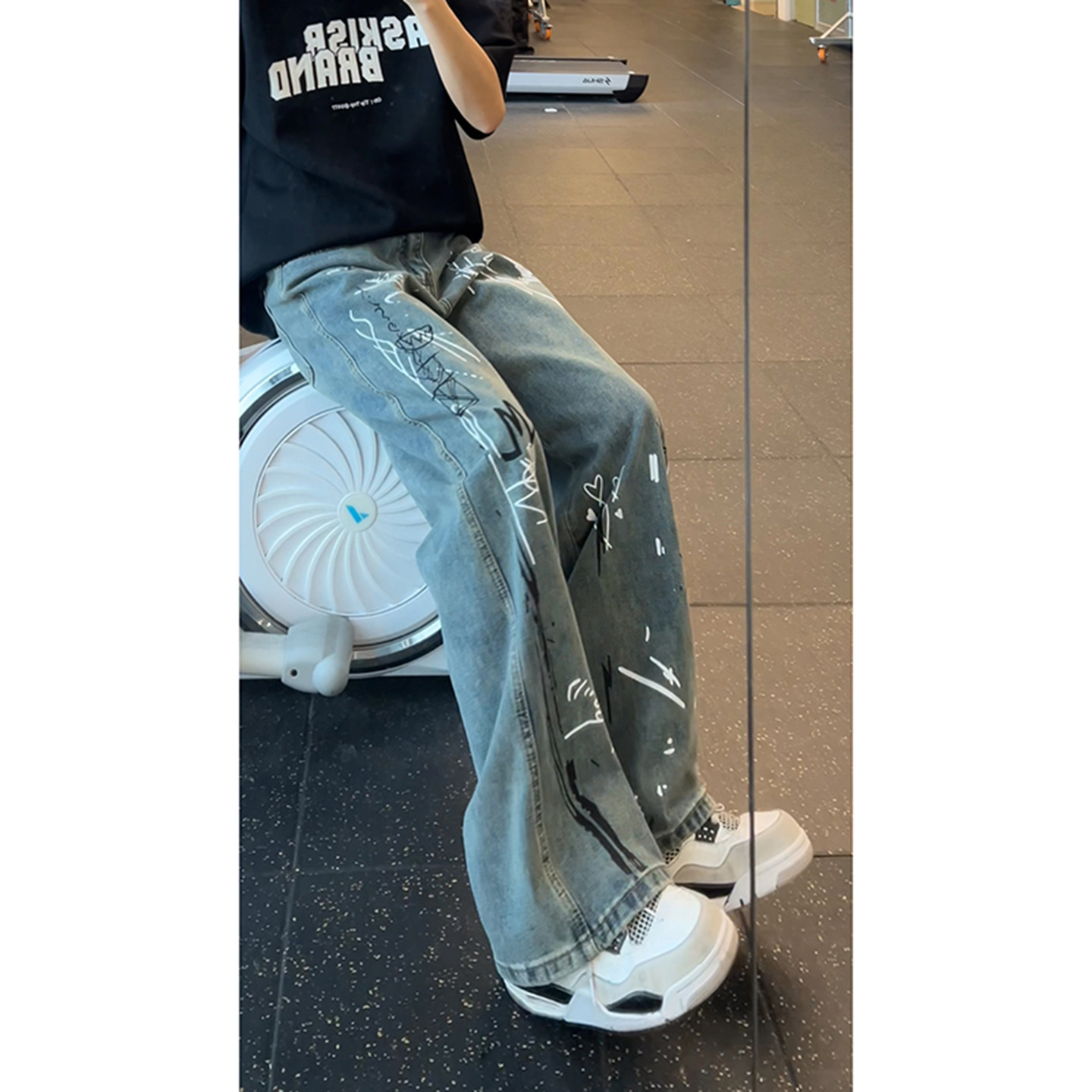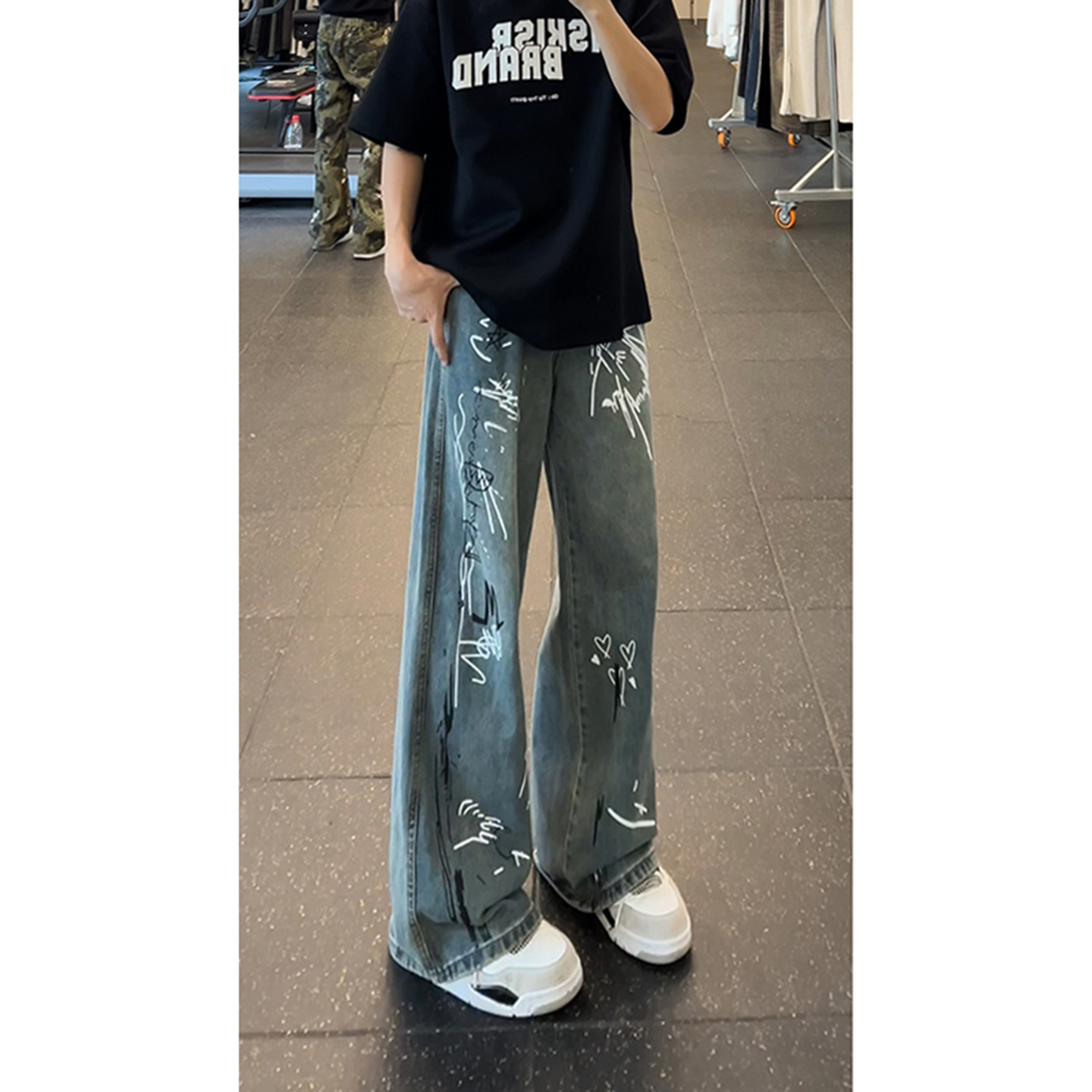 Doodle Print Denim Pants Men Wide Leg Loose Design Sense Niche Pants High Street Hip Hop Wide Leg Trousers