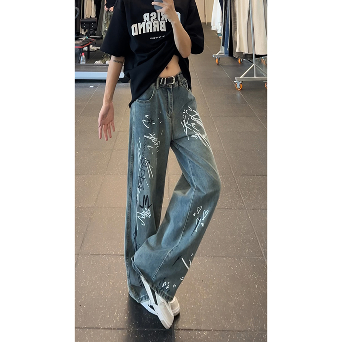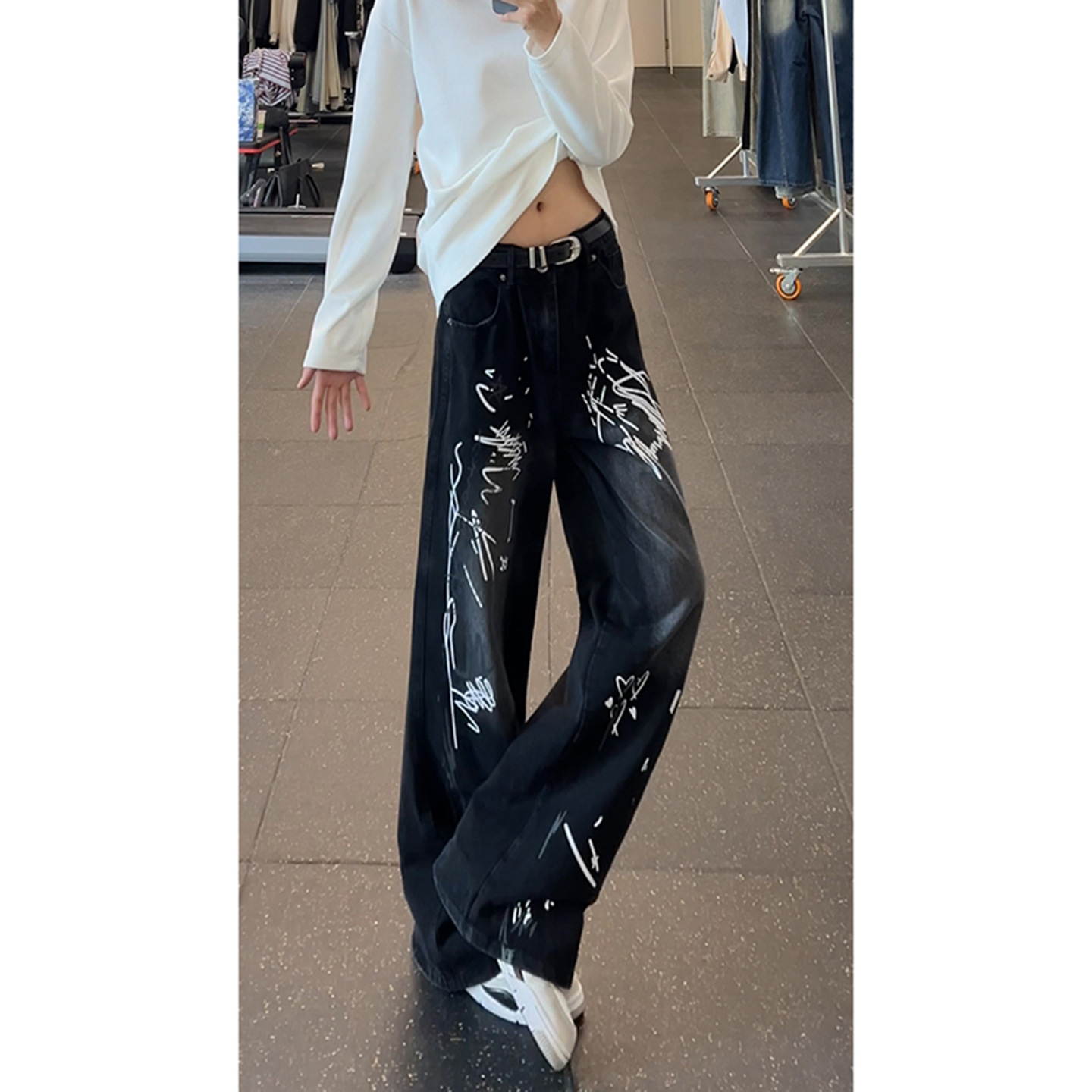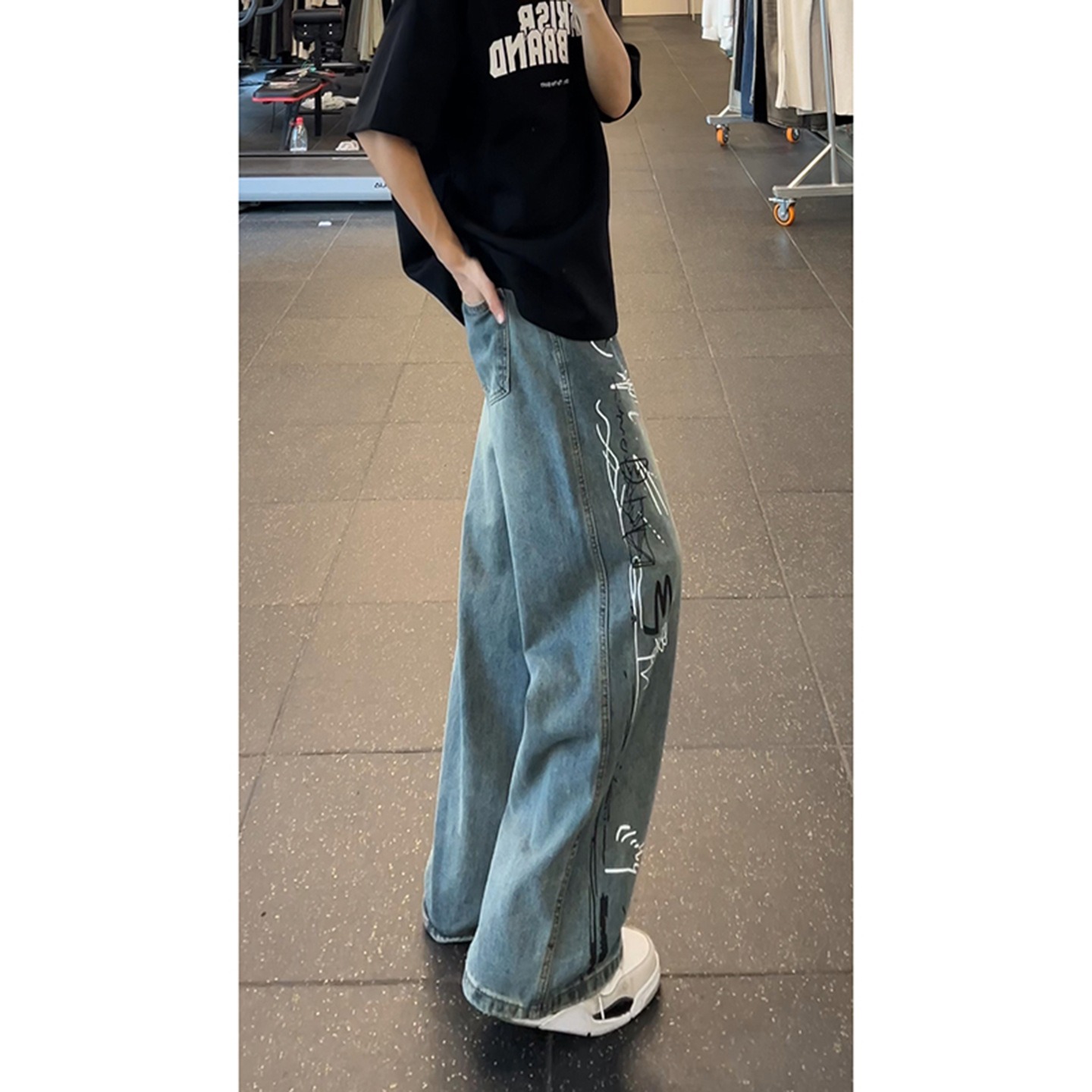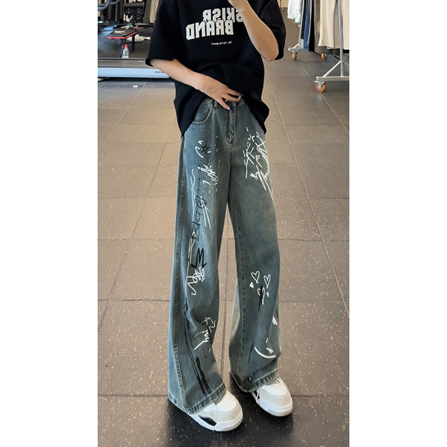 Doodle Print Denim Pants Men Wide Leg Loose Design Sense Niche Pants High Street Hip Hop Wide Leg Trousers